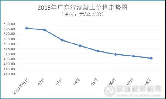 (四)混凝土價格維持弱勢走勢。8月份廣東省混凝土價格繼續維持偏弱走勢,全省平均批發價為每立方米496元,環比微降0.43%。其中,粵東、粵北和珠三角地區均價分別為每立方米435元、460元和564元,環比分別微降0.25%、1.0%和0.25%;粵西地區價格為每立方米400元,環比持平。