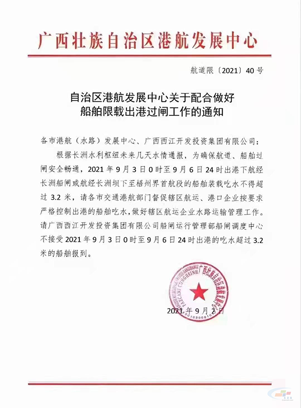 2021年9月3日0時至9月6日24時出港下航經(jīng)長洲船閘或航經(jīng)長洲壩下至梧州界首航段的船舶裝載吃水不得超過3.2米。......