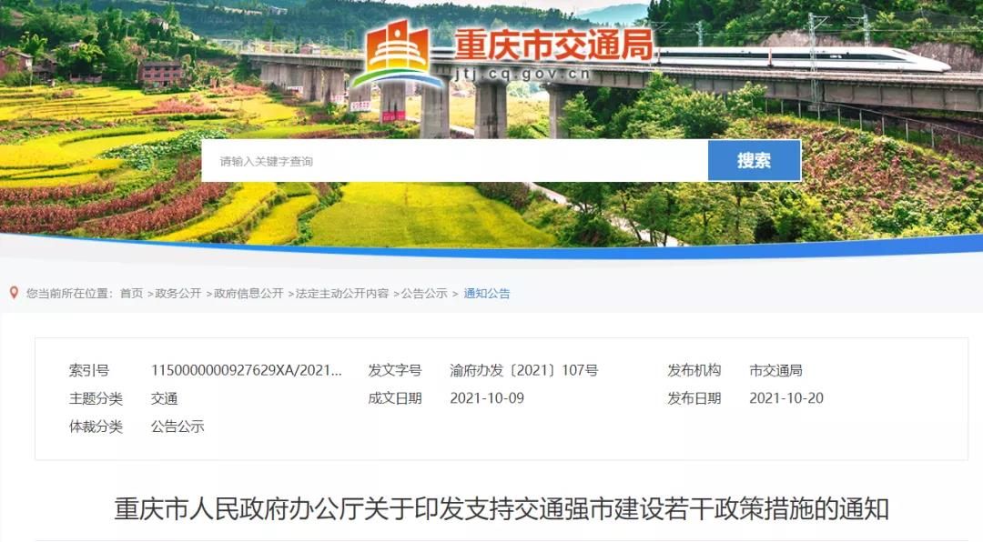 近日,重慶市印發(fā)《支持交通強(qiáng)市建設(shè)若干政策措施》,文件不僅明確“十四五”期間安排市級(jí)財(cái)政資金1150億元,統(tǒng)籌用于高速鐵路、高速公路、普通國(guó)省干線公路、民航、水運(yùn)以及支持鄉(xiāng)村振興的農(nóng)村公路等交通基礎(chǔ)設(shè)施建設(shè)。